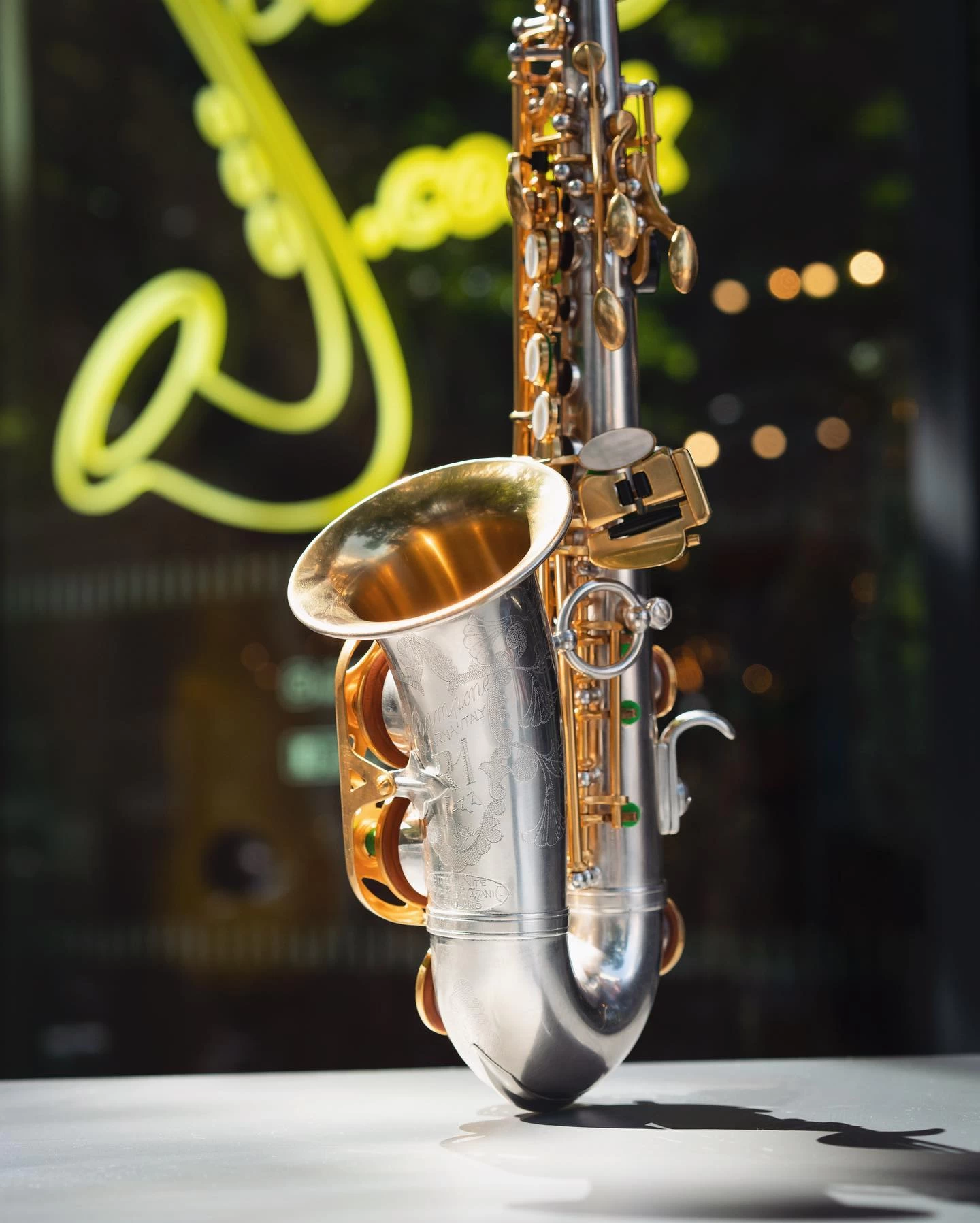 Stand out from the crowd with this beautiful and specialist ‘AUG’ Rampone Curved Soprano.Ā This sax looks and sounds stunning with its contrasting silver plated body and gold plated bell and keys.Ā For sure one of our favorite saxes here at sax.co.uk!