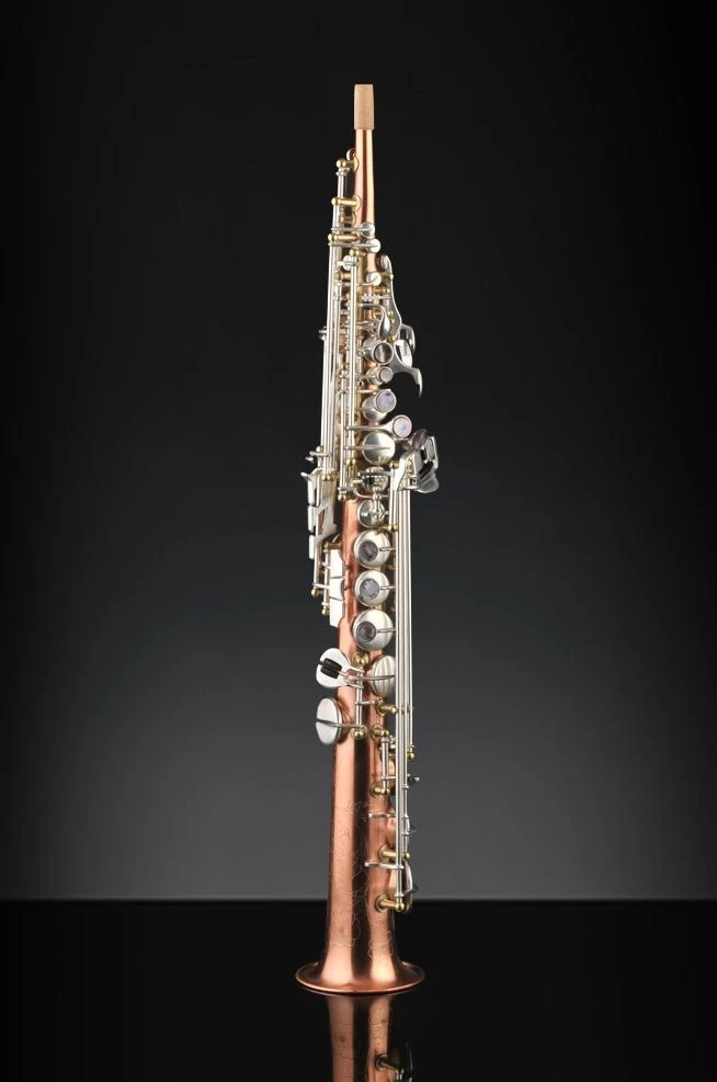 Copper Saxophone with Silver Plated keys. Unlacquered finish to free harmonics. Hand hammered bell, body and neck. Light key work and action. Elaborately hand engraved.