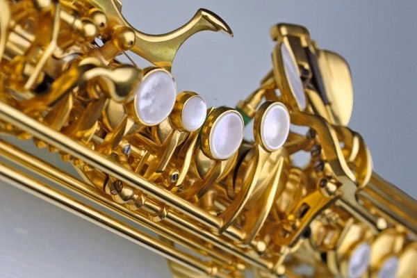 Brass Saxophone with Gold Plating. Unlacquered finish to free harmonics. Hand hammered bell, body and neck. Light key work and action. Elaborately hand engraved.