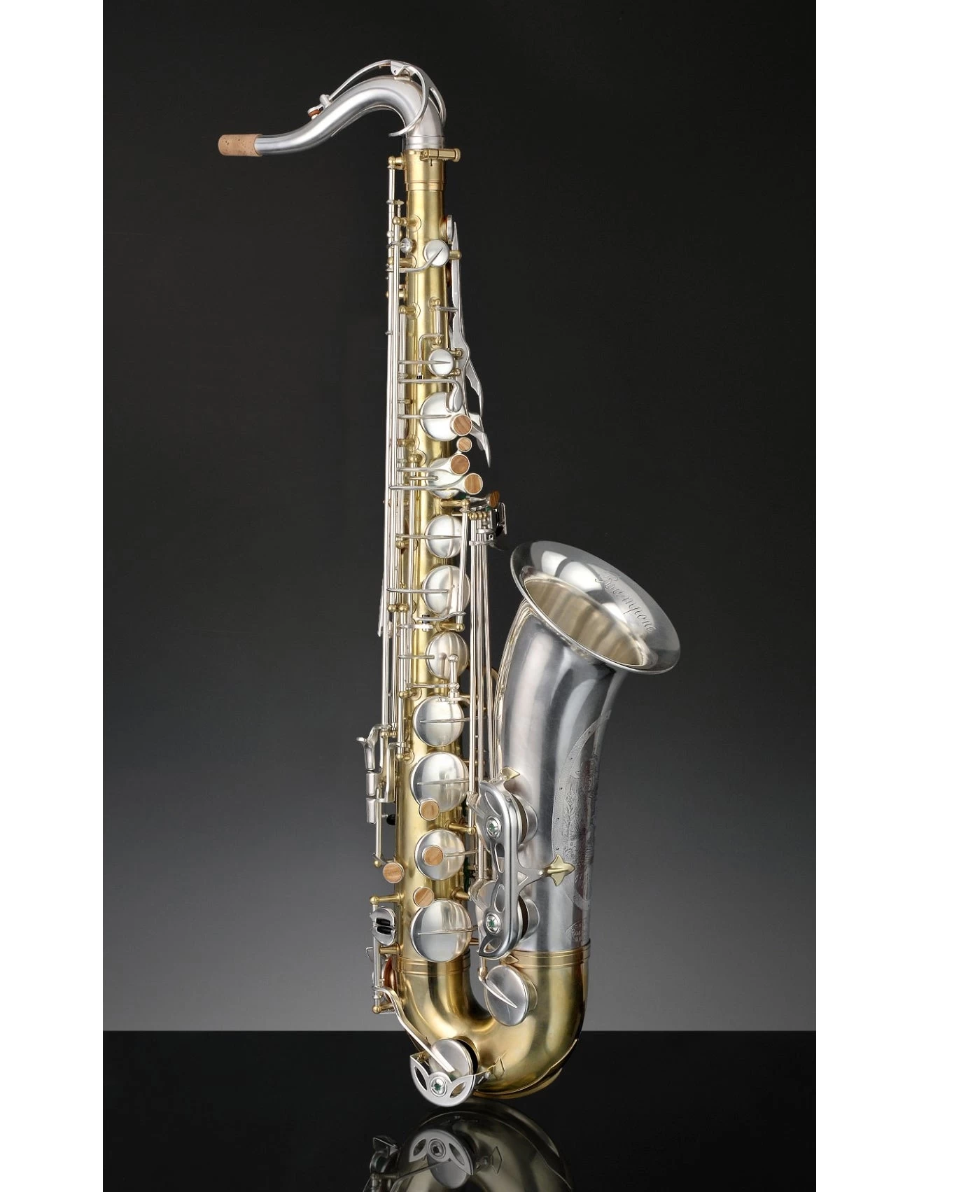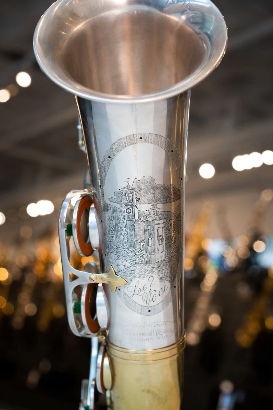“Two Voices” refers to the two metals and the bell engraving which is taken from an old painting depicting the two church bell towers of Quarna Sotto, where the saxes are made. Appropriately, this painting is called “Due Voci.” A print of the painting signed by the engraver Claudio Zolla accompanies the saxophone.