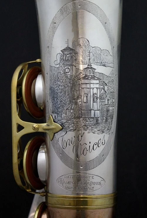 “Two Voices” refers to the two metals and the bell engraving which is taken from an old painting depicting the two church bell towers of Quarna Sotto, where the saxes are made. Appropriately, this painting is called “Due Voci.” A print of the painting signed by the engraver Claudio Zolla accompanies the saxophone.
