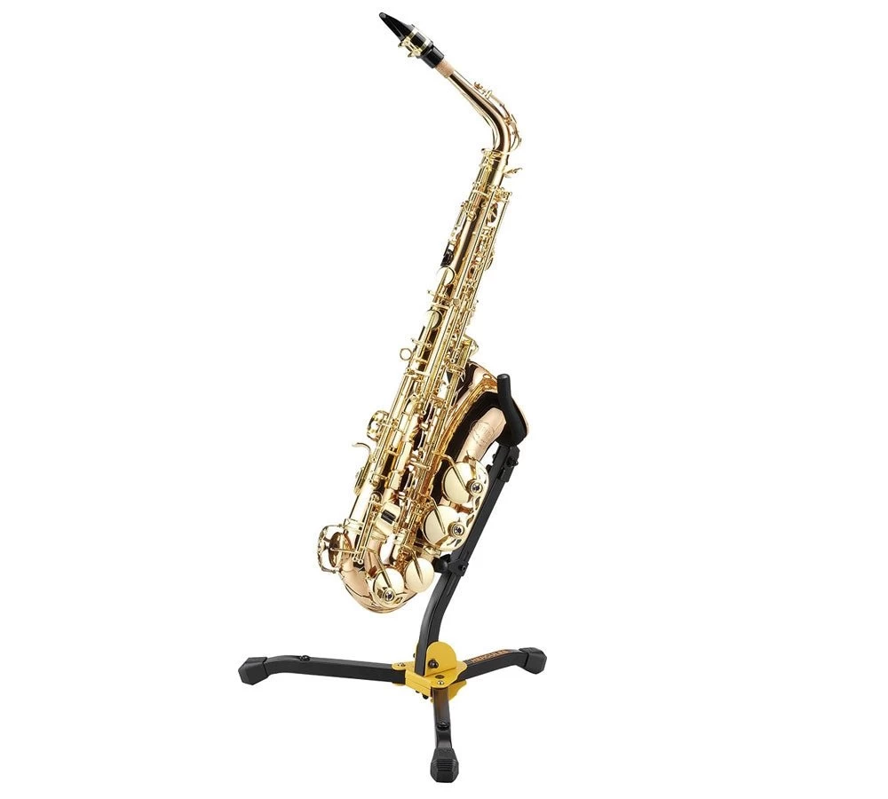 The HERCULES Saxophone Stand DS530B has a folding yoke, an adjustable backrest, and locking pins that are secure and stable for use with Tenor or Alto Saxophones.